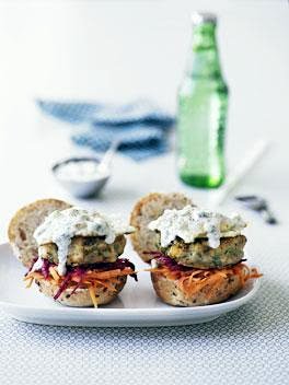 6 Toast cut side of burger buns, top bun halves with carrot, beetroot, patties, fried egg and mint yoghurt sauce, sandwich and serve immediately