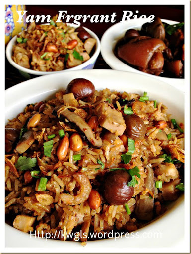 For serving, have your rice in a serving plate or bowl, top with garnishes such as chopped spring onion, peanuts, chestnuts and additional shallot. Can be a standalone rice dish or part of the dish in a typical Chinese set meal.