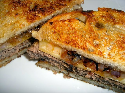 Season the meat with salt and pepper to taste and form into 4 burgers the size of the rye bread. In the meantime, slice the onions in rings and saute in a little olive oil until desired doneness. Remove from pan and add a little oil and fry burgers until browned and cooked to desired doneness. Remove from pan. Spread butter on the outside of ryebread. Arrange in skillet, ryebread, cheese, onions and burgers. Cook until bread is browned and cheese is melted, about 5 minutes. Remove from pan and cut crosswise.