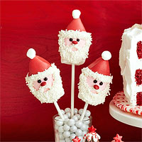 Line a cookie sheet with parchment or waxed paper. Cut 6 of the large white marshmallows in half crosswise with clean scissors. Insert a lollipop stick into center of uncut side of a marshmallow half and push it about 11/2 inches onto stick. Thread a pink and then a whole white marshmallow, flat side onto lollipop stick, pressing them to marshmallow half. Make sure end of stick remains covered with whole white marshmallow. Cut a corner from opposite sides of whole white marshmallow to create a triangle for Santas hat. Transfer stick to prepared cookie sheet. Repeat to make 11 more sticks. Cut mini marshmallows in half crosswise; set aside.