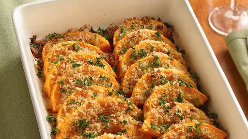 1 Heat oven to 375°F. Spray 13x9-inch (3-quart) glass baking dish with cooking spray. Peel, halve lengthwise and seed squash; cut into 1/2-inch-thick slices. Arrange with slices overlapping slightly in bottom of baking dish.