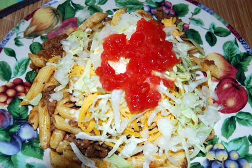 Add the sauce to the pasta and toss. Spoon into a serving dish, top with the cheese and tent with foil to melt the cheese, about 1 minute. Top with the remaining onion, the tomatoes and lettuce – just like tacos!