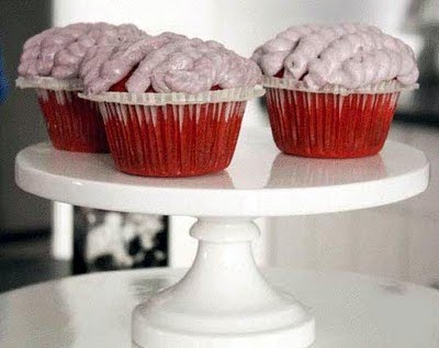 Fill the pastry bag half full with the frosting, and pipe out into a squiggly pile on half of each cupcake top, then pipe the frosting in a squiggly pile on the other half of the cupcake top, making 2 brain hemispheres. This recipe gives a whole new meaning to brain food.