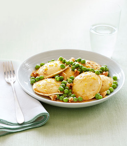 3 Toss ravioli, peas, browned butter, chopped walnuts, finely grated lemon peel, and salt in same bowl. Divide among 6 serving bowls; sprinkle with grated Parmesan cheese.