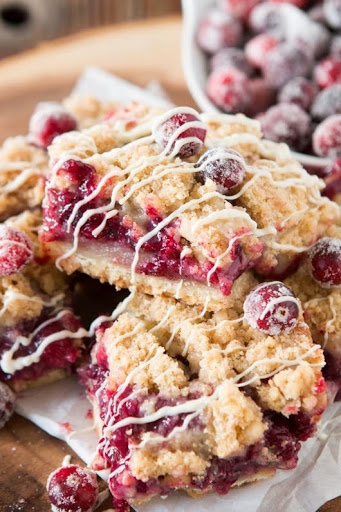 Place the cranberries in a bowl with the ⅓ cup sugar and toss to coat. Serve over the bars.