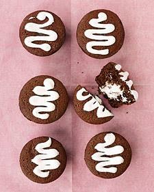 Using a small melon baller, scoop out center of each cupcake from the bottom, and reserve (you will use this to plug cupcake after filling). Hollow out each cupcake a bit more, discarding crumbs. Insert tip of plastic bag into each cavity, and squeeze to fill; replace plugs. Using remaining filling in plastic bag, decorate top of cupcakes.