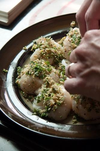Wash scallops and pat dry with paper towel, place in small bowl. Add olive oil and coat. Dip scallops in coating turning to cover evenly. Gently press the crumbs onto the scallops. Place scallops in single layer on clean platter. Cover with plastic wrap and refrigerate for 30 minutes to set the breadcrumbs.