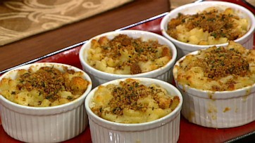 Turn off the heat and add 3/4 of the aged cheddar and all of the other cheeses. Season with cayenne, salt and black pepper and fold in macaroni. Divide into 4 ramekins and top with remaining cheddar.