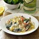In a small pan, heat remaining 1 tablespoon of butter. Cook shrimp for about 2 – 4 minutes or until done. Remove from pan and add to cream sauce. Add spinach to the small pan and heat just until wilted, about 3 minutes. Toss spinach and shrimp with cream sauce.