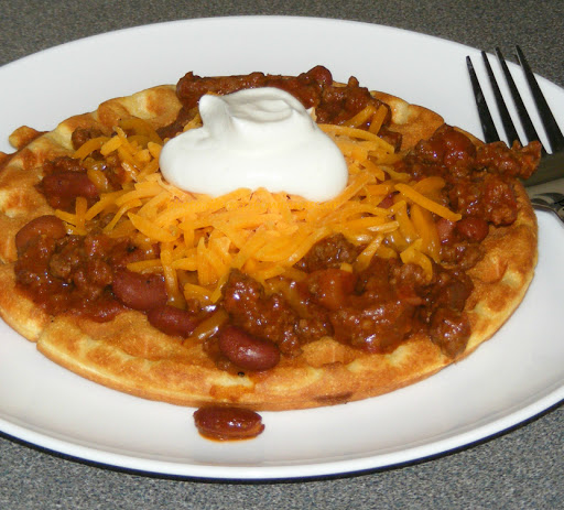 Homemade cornbread waffles topped with chili with beans (homemade or canned) and shredded mild cheddar cheese (and other toppings such as sour cream, seeded and finely diced tomato, shredded lettuce, and taco sauce, if desired)