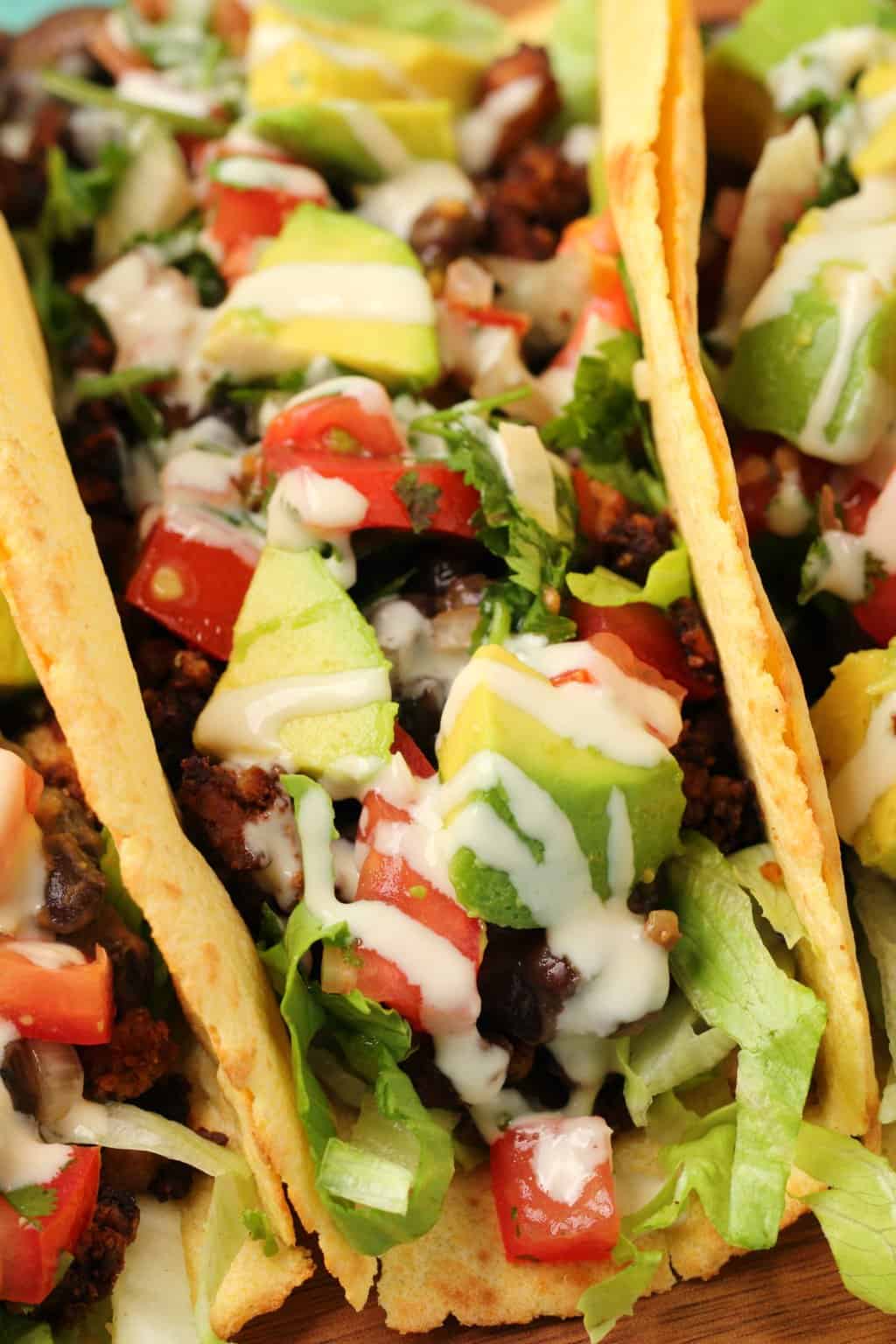 These versatile vegan tacos are packed with black beans, vegan taco meat, pico de gallo and avocado and topped with a tahini sauce. Filling, colorful and delicious!