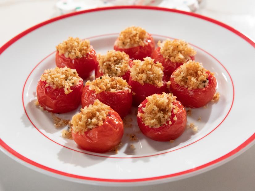 Sprinkle the tomatoes with 1/4 teaspoon salt. Stuff each tomato with a pinch of the chopped basil and a mozzarella ball and set on a small rimmed baking sheet.