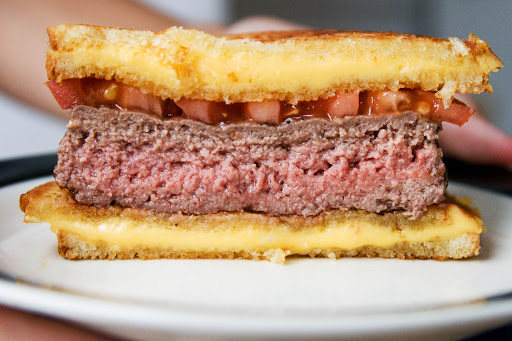 Divide beef into 4 equal parts. Shape into square patties slightly larger than the grilled cheese sandwiches that will serve as buns. Create a slight indentation in the center of the patties.