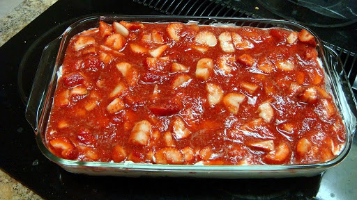 4. In a bowl, combine strawberries and glaze until strawberries are evenly coated. Spread over cream cheese layer. Chill until serving.