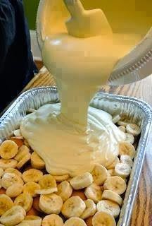 Pour the mixture over the cookies and bananas and cover with the remaining cookies.