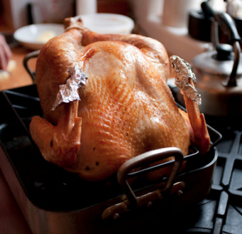 When roasting is done, tip turkey so interior juices run back into pan. Remove turkey to a separate baking sheet or serving platter, cover with foil and then a damp kitchen towel and allow to rest for at least 30 minutes.