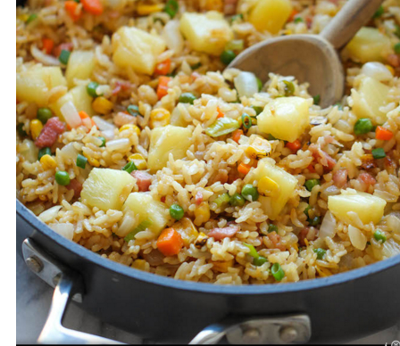 Stir in rice, pineapple, ham, green onions and soy sauce mixture. Cook, stirring constantly, until heated through, about 2 minutes.