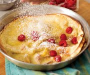 4. Place pan in oven and bake 12 to 15 minutes, until puffed and golden. Squeeze lemon over top and sprinkle with powdered sugar and fresh berries. Cut pancake in pan and serve with a spatula. Serve immediately.