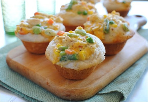 Evenly spoon the pot pie mixture into each biscuit cup. Slide into the oven and bake for about 15 minutes. Check at the 12 minute mark.