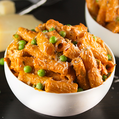 To the sauce/chicken, add two tablespoons butter and 1/2 cup peas. Stir until the butter melts. Combine chicken/sauce mixture with cooked pasta. Garnish with fresh parmesan cheese, and a pinch or two of red pepper flake