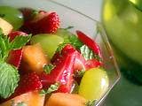 Chop and combine the cantaloupe, strawberries, grapes, and mint in a large bowl. Pour the warm wine mixture over; toss to coat. Cover and refrigerate until cold, stirring occasionally, at least 2 hours.