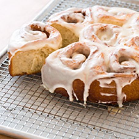 7. FOR THE GLAZE: Place cream cheese in large bowl and whisk in butter, milk, vanilla, and salt until smooth. Whisk in sugar until smooth. Pour glaze evenly over tops of buns, spreading with spatula to cover. Serve.