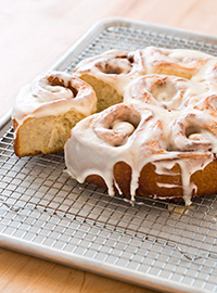 Most recipes for quick cinnamon buns result in something more like a biscuit—they rely on chemical leaveners (baking powder and soda) instead of yeast. To get the soft sweet-bread texture and yeasty flavor of a true bun with a quicker timetable, we use both yeast and baking powder. After shaping, the buns need only 30 minutes of rise time. A low oven temperature ensures that they have enough time to rise high before the tops set, creating a fluffy interior. A buttery brown sugar filling and tangy cream cheese glaze make these buns irresistible.