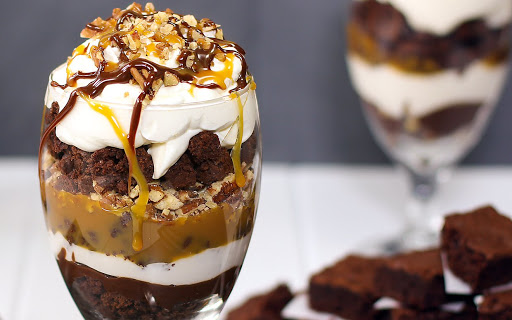 3. Dollop 2 tablespoons vanilla cream over top. Add 2 tablespoons brownies and drizzle 1 tablespoon (or more if the mood strikes you) caramel sauce over brownie. Sprinkle with pecans. Repeat until all ingredients are used.