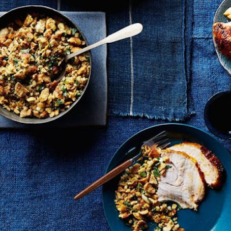 Use a large mortar and pestle or a fork to smash plantains, cracklings and garlic until somewhat smooth. Mash in cilantro and salt to taste. 15 minutes before turkey has finished cooking, fill inner cavity with mofongo stuffing and a ladleful of pan juices. Once turkey and stuffing are done cooking, transfer stuffing to a serving dish.