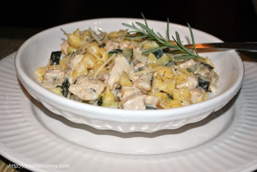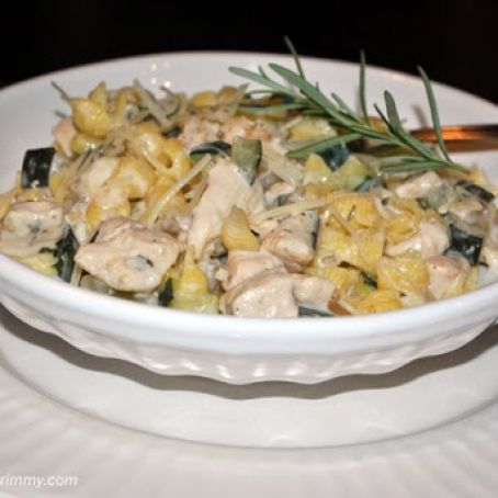 4. Combine chicken and zucchini mixture with remaining ingredients, including pasta. Spread in a baking dish bake for 20 minutes until dish is heated through and the cheese is melted.