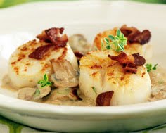 4. Add whisky to large skillet; boil for about 1 minute, stirring to scrape up browned bits from bottom of skillet, until liquid is syrupy. Add stock; bring to a boil over high heat. Boil for 2 to 3 minutes, until liquid is reduced to about ¾ cup (175 mL). Strain into skillet containing mushrooms; stir in cream and any juices that have accumulated under scallops. Simmer for 2 to 3 minutes until sauce thickens slightly; stir in thyme. Season to taste with salt and more pepper if needed. Divide sauce among 4 shallow bowls; top each portion with 3 scallops. Sprinkle with bacon; garnish with thyme.