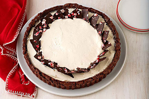 Spray 9-inch tart pan with removable bottom with cooking spray. Prepare brownie batter as directed on package; stir in peppermint extract. Spread onto bottom of prepared pan.