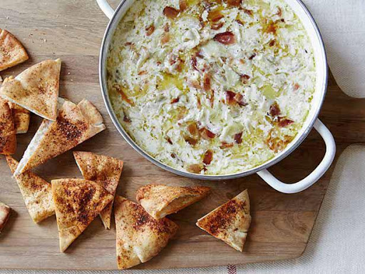 Transfer the vegetables to a food processor. Add the mascarpone cheese, sour cream, mayonnaise, lemon juice, 1/2 of the cooked bacon pieces and the remaining 1 teaspoon salt. Pulse until combined but still chunky. Place the dip in the prepared baking dish and sprinkle with the remaining bacon pieces. Bake until just warmed through (do not let the dip boil), 10 minutes. Serve the pita chips alongside.
