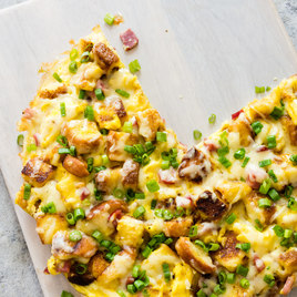 3. Transfer skillet to oven and bake until surface of strata is slightly puffy and cheese is melted, 5 to 7 minutes. Remove skillet from oven and let stand for 10 minutes. Using spatula, loosen strata from skillet and slide onto platter or cutting board. Sprinkle with scallion greens. Cut into wedges and serve.