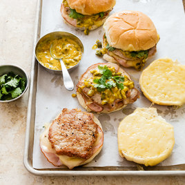 For a twist on the classic Cuban sandwich, we start by browning a pork cutlet. Then we top it with ham, melted Swiss cheese, pickles, and a tangy orange-mustard sauce.