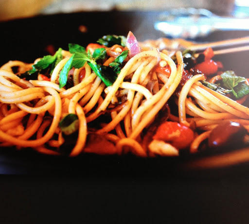 2. While pasta is cooking, heat oil in a large skillet over medium heat. Add garlic, red-pepper flakes, and anchovies. Cook, stirring, until aromatic, 1 to 2 minutes. Add tomatoes, reserved juice, capers, and olives. Bring to a boil. Lower heat to a simmer, and cook, stirring frequently, until slightly thickened, about 5 minutes.