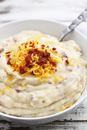 Add sour cream, milk, garlic, salt, and pepper to potatoes. Use a hand mixer to blend together all ingredients. (Please see note below recipe!) Give them a taste and add more salt if desired. Serve plain, or with any favorite toppings such as gravy, or cheese and bacon.