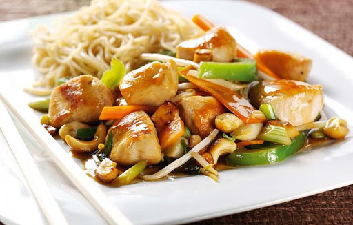 Stir in the sauce and bring to a boil. Reduce the heat and simmer until the sauce thickens and the chicken is cooked through, 2 to 3 minutes. Stir in the toasted cashews and serve immediately.