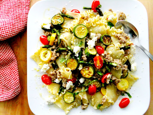 Lasagnetti with Crumbled Sausage, Asparagus and Zucchini Coins