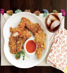 Roll one stip of chicen at a time in the salsa, patting it to stick. Roll in the flavored crumbs. Place onto the prepared pan. Repeat with remaining chicken, including the tenders.