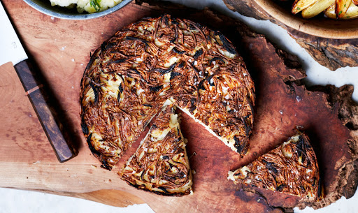 Place racks in highest and lowest positions in oven; preheat to 425°. Line two 8" cake pans with parchment; brush with 2 Tbsp. oil. Toss onions, vinegar, and 1 Tbsp. kosher salt in a large bowl. Let sit until onions are softened, 5–10 minutes (massage gently to speed up process).