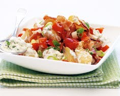3 Stir dressing with cooled potatoes until mixed. Add bacon, red pepper and green onions.