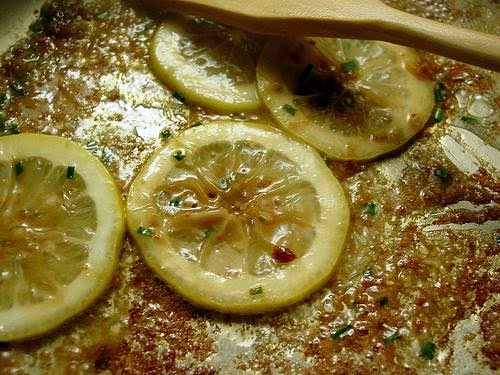 Arrange on noodles. Pour on sauce. Garnish with remaining lemon slices.