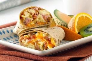 BEAT whole egg, egg whites and ham until well blended. Heat nonstick skillet sprayed with cooking spray on medium-high heat. Add egg mixture; cook 3 min. or until set, stirring occasionally. SPOON egg mixture down centers of tortillas; top with cheese. Fold in opposite sides of each tortilla, then roll up burrito-style.