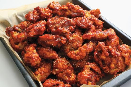 Fry the wings again: Fry in batches, turning a few times, until the wings are golden brown and very crunchy on the outside, 10 to 12 minutes. Transfer the wings to a strainer and shake to drain, then add them to the pan with the sauce and stir until the chicken is coated.
