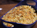 To complete the dish, melt a couple of tablespoons butter in a small skillet, over low heat and add 3 tablespoons hot sauce. Warm through, then add the panko crumbs and toss to evenly coat the crumbs in sauce mixture. Cool the crumbs, then toss in the parsley and 1/2 cup grated Parmigiano Reggiano cheese. Top the mac n cheese with the spicy crumb mixture. Arrange individual crocks on a baking sheet or put the casserole on baking sheet to catch any drips.