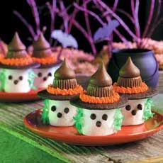 * For the face of each witch, place a dab of frosting on the bottom of three chocolate chips; press two for eyes and one for nose onto each marshmallow.