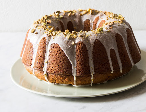 Pour glaze over the cooled cake and finish a sprinkle of chopped pistachios. Slice and serve.