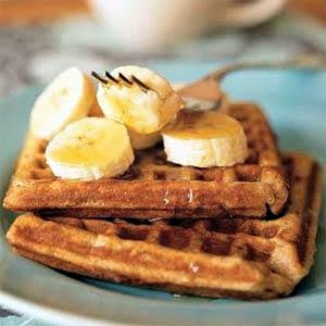 Preheat a waffle iron. Coat iron with cooking spray. Spoon about 1/4 cup batter per 4-inch waffle onto hot waffle iron, spreading batter to edges. Cook 3 to 4 minutes or until steaming stops; repeat procedure with remaining batter.
