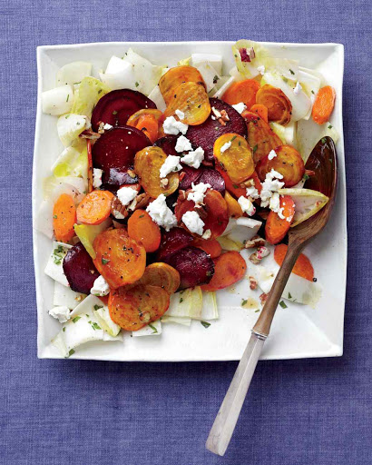 Meanwhile, in a small bowl, whisk together orange juice, vinegar, tarragon, and 1 1/2 tablespoons oil; season with salt and pepper. In a large bowl, toss endives with half the dressing, then transfer to a serving platter. Toss beets and carrots with remaining dressing and add to platter. Top with goat cheese and pecans before serving.